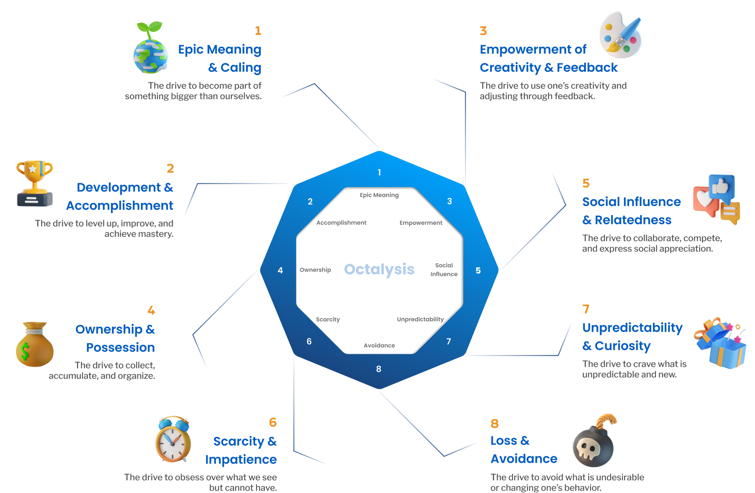 We use the Octalysis Framework to decipher the complexity of human motivation through the 8 Core Drives, each representing a fundamental motivator that guides human actions and behaviors.