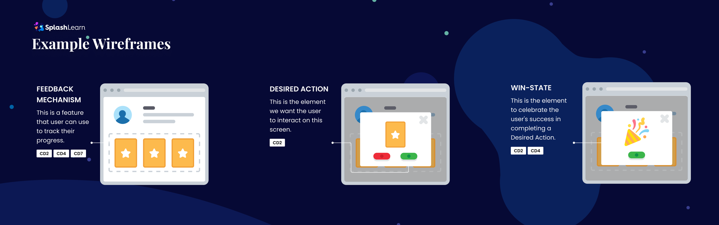 We used the Octalysis 8 Core Drives to guide us in crafting a captivating and interactive experience for SplashLearn. In the example below, we illustrate how each wireframe element, from buttons to progress indicators, is strategically placed to leverage these Core Drives, creating an experience that not only looks aesthetically pleasing but most importantly drives Desired Actions. Our final deliverables included high-fidelity wireframes and interactive prototypes. However, since the product is still under development, I can only provide an example in low-fidelity.