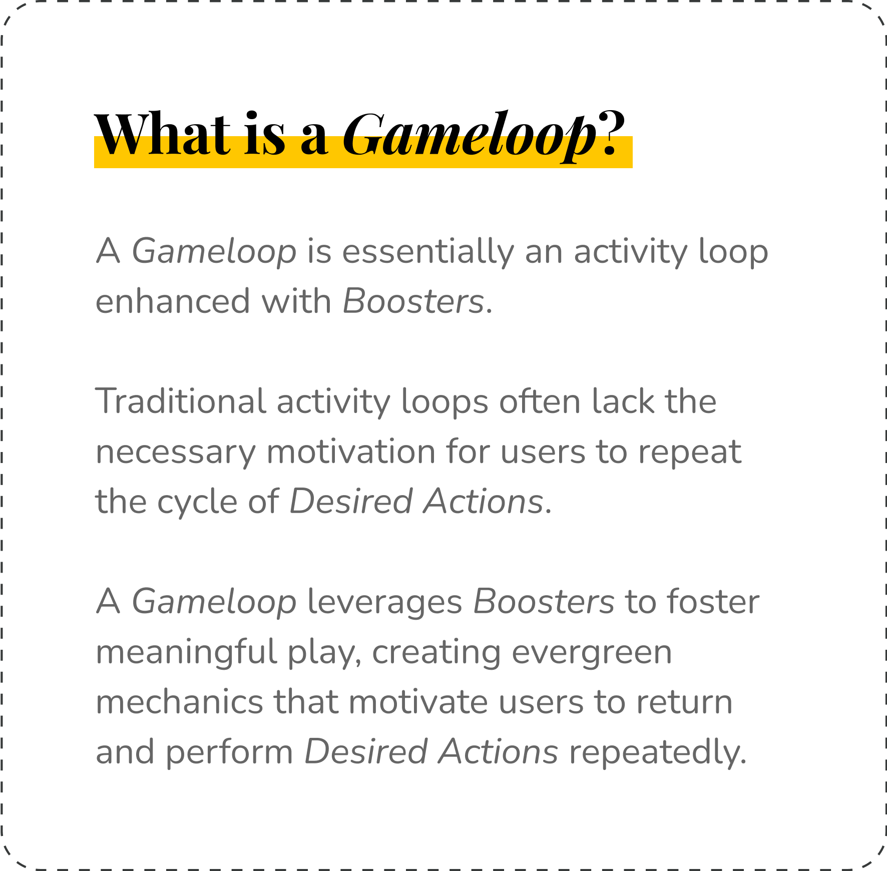 In a more robust gamified system, users should gain a special power that aids them in performing Desired Actions more effectively. For instance, upon upgrading, instead of earning 3 coins, they could earn 5 coins. This special power, known as a Booster, when incorporated into an activity loop, transforms it into a Gameloop (see on the right) that is more engaging and sustainable in the long term.